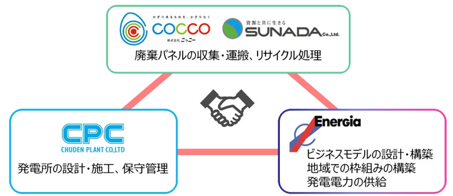 株式会社こっこー※1(以下「こっこー」)、株式会社スナダ※2(以下「スナダ」)、中電プラント株式会社※3(以下「中電プラント」)および中国電力株式会社※4(以下「中国電力」)は、本日、使用済み太陽光パネル(以下「廃棄パネル」)のリユース・リサイクルに関する業務提携契約を締結しましたのでお知らせします。