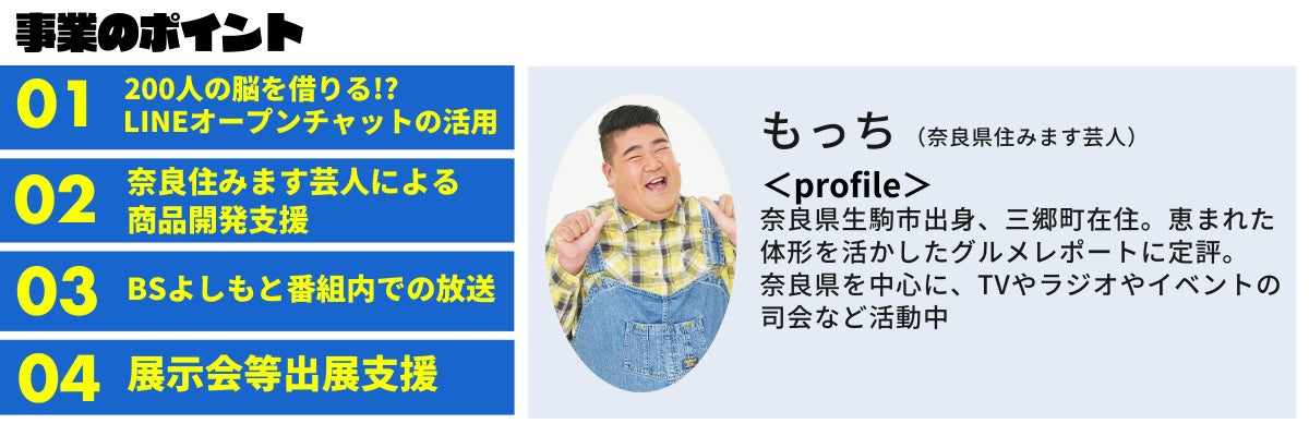 商品開発では、奈良県住みます芸人もっち氏が管理するLINEオープンチャット「もっちの奈良グルメうまっちー情報誌」のサブトークルームを活用し、約200名のユーザーからアイデアを募りながら商品づくりを進めてまいりました。いただいたアイデアをもとにもっち氏と目利氣358株式会社が試行錯誤しながら商品開発を行い、オープンチャット参加者との試食会などを経て完成いたしました。