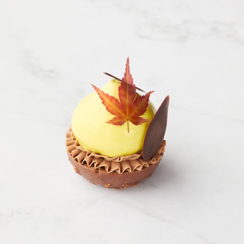 甘酸っぱい柚子クリーム入りのチーズムースと、ジャンドゥーヤムースの濃厚なチョコレートと香ばしいナッツの風味が一体となり、爽やかな秋の風を感じるケーキが誕生しました。