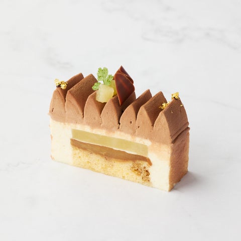 まろやかな洋梨ムースの中にソテーした洋梨と洋梨ゼリーを忍ばせ、シナモン風味のチョコレートクリームを合わせました。幾重にも重なる洋梨の芳香と、シナモンが香る上質なチョコレートクリームとの調和をお楽しみいただけます。