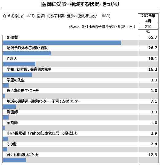 医師に相談する前に相談した相手に関する質問では、「配偶者」が65.7%、「配偶者以外のご家族・親族」が26.7%と高い割合を占めたのに対し、「ご友人」(18.1%)、「学校、幼稚園、保育園の先生」(16.2%)、「学童の先生」(3.3%)など、家族以外への相談は大幅に低い結果となり、また「誰にも相談しなかった」という回答も12.9%存在しました。特に小学校中学年・高学年頃になると宿泊行事や友人とのお泊り行事など、家族の目の届かないところでの子どもの活動も増えてくる中で、親としては学校の先生などに相談しサポートを受けることも重要であるため、現状家族以外に相談できず、そういったサポートを受けられずに悩んでいる親も一定数存在する可能性があります。