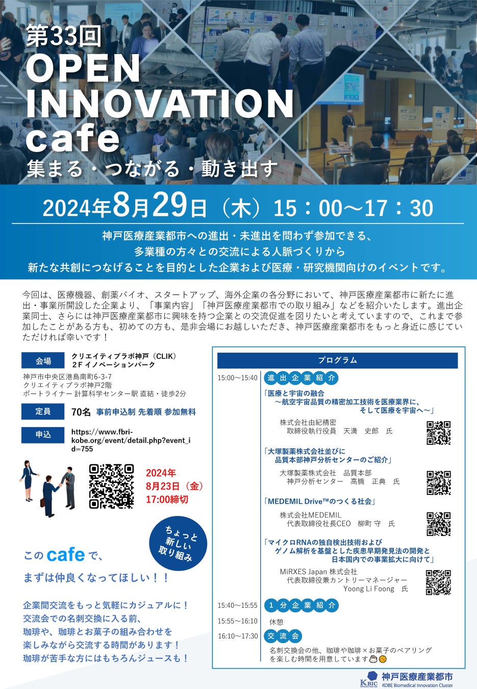 株式会社MEDEMILは2024月8月29日に「第33回OPEN INNOVATION cafe 集まる・つながる・動き出す」(主催:公益財団法人神戸医療産業都市推進機、共催:神戸市)に登壇しました。