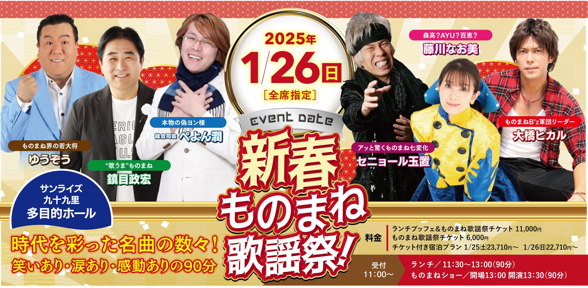また、新春のイベントとして、2025年1月26日(日)にものまねタレントのアッと驚くものまね七変化「セニョール玉置」、ものまね界の若大将「ゆうぞう」他、「大橋ヒカル」、「鎮目政広」、「藤川なお美」、「ぺよん潤」による新春ものまね歌謡祭in九十九里を開催いたします。