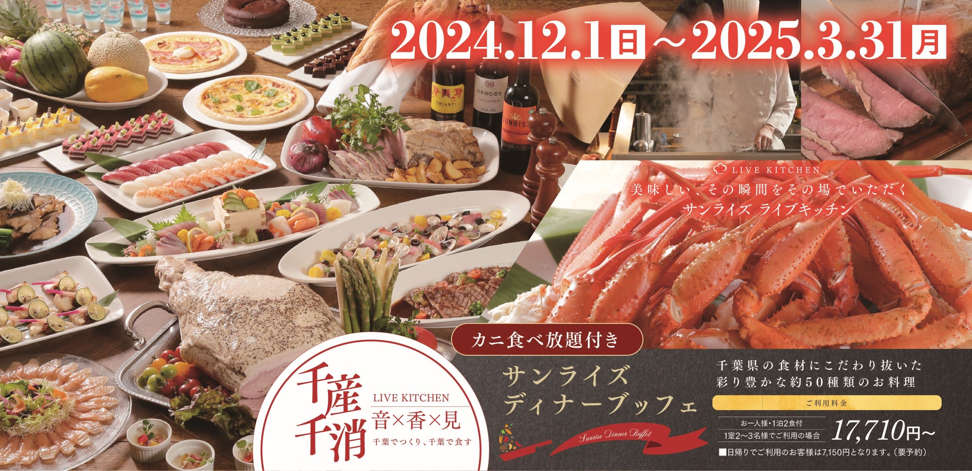 カニ食べ放題付サンライズディナーブッフェと千葉県の幸と山武、九十九里の幸を贅沢に詰め込んだ葉武里特撰会席プランのご案内!2025年幕開け新春イベントとしてものまね歌謡祭in九十九里を開催!