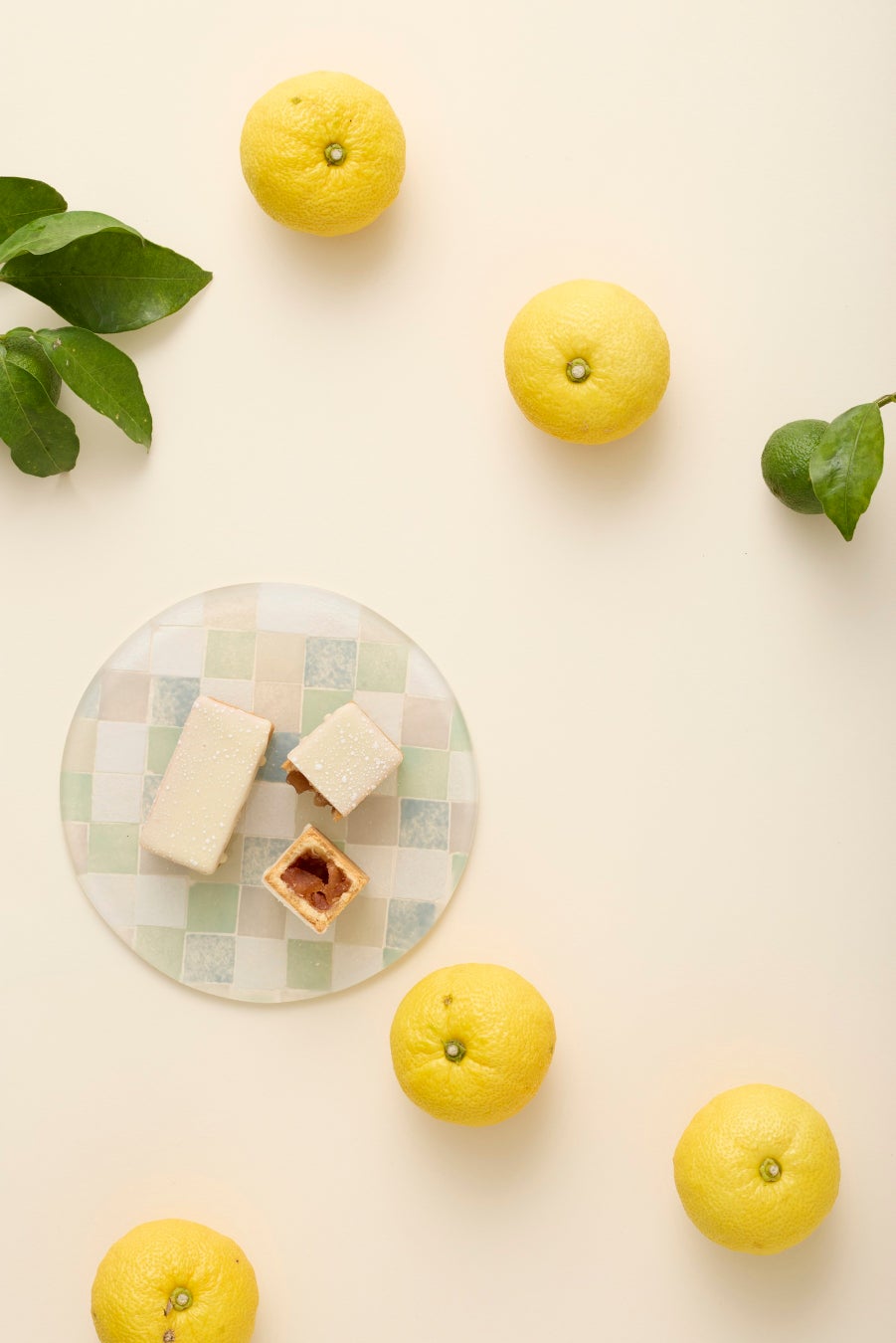 りんごのフィリングは、焼き菓子でありながらりんごジャムではなく、りんご果実そのままの甘酸っぱさと歯ごたえが楽しめる、サニーヒルズ独自の特別製法で作られています。それを、フランスの発酵バターや日本で製粉された小麦粉をはじめ、世界中から厳選した素材で作ったクッキー生地で包み焼き上げました。さらに、フランスの老舗チョコレートブランド「ヴァローナ」のゆずクーベルチュールをたっぷりかけた、季節感あふれる一品です。