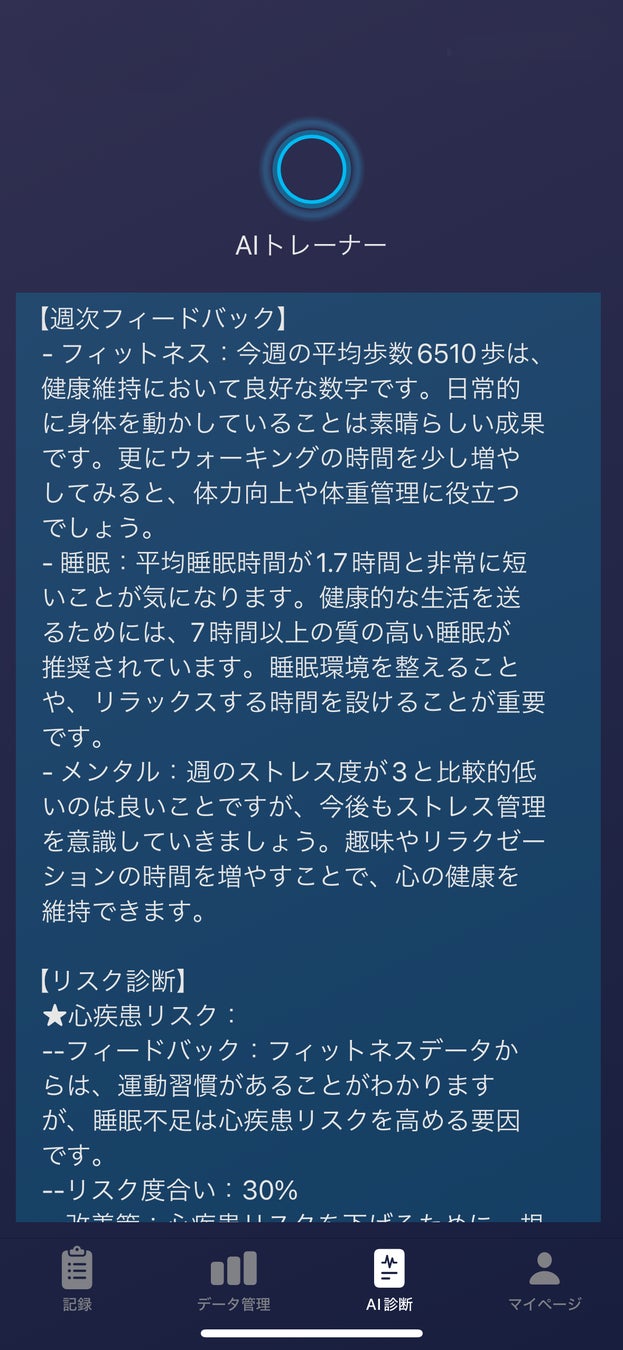 「ヘルストレーナー」は、ユーザーの「体重」「フィットネス」「睡眠」「メンタル」のデータを記録し、AIトレーナーが目標達成度や改善点をフィードバックします。これにより、忙しい現代人でも無理なく健康管理が可能となり、健康寿命の延伸に貢献します。さらに、iPhone標準のヘルスケアアプリと連携することで、データ入力の手間を減らし、日々の健康管理を効率化します。