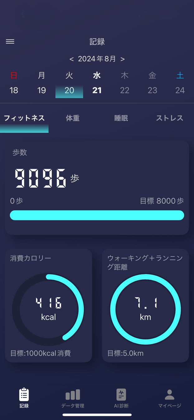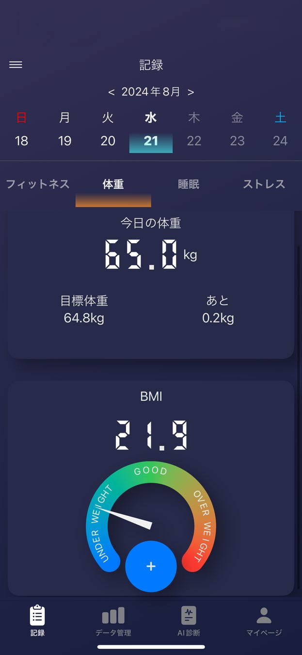 体重、フィットネス、睡眠、メンタルのライフログを記録。ヘルスケアアプリとのデータ連携により、データを自動取得。