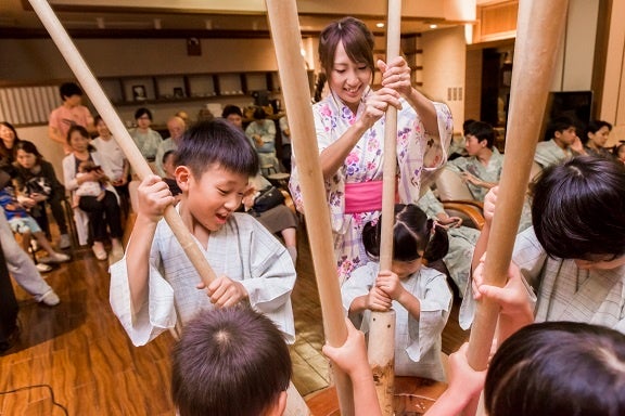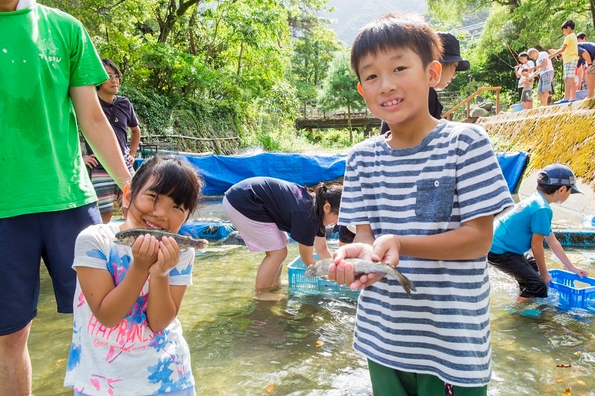 都会では味わえない魚のつかみ取りや釣り体験。夜は縁日や手持ち花火、太鼓ショーと餅つき大会も
