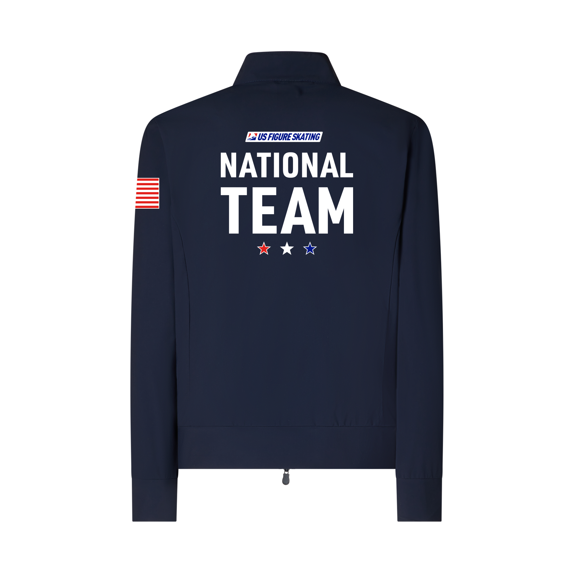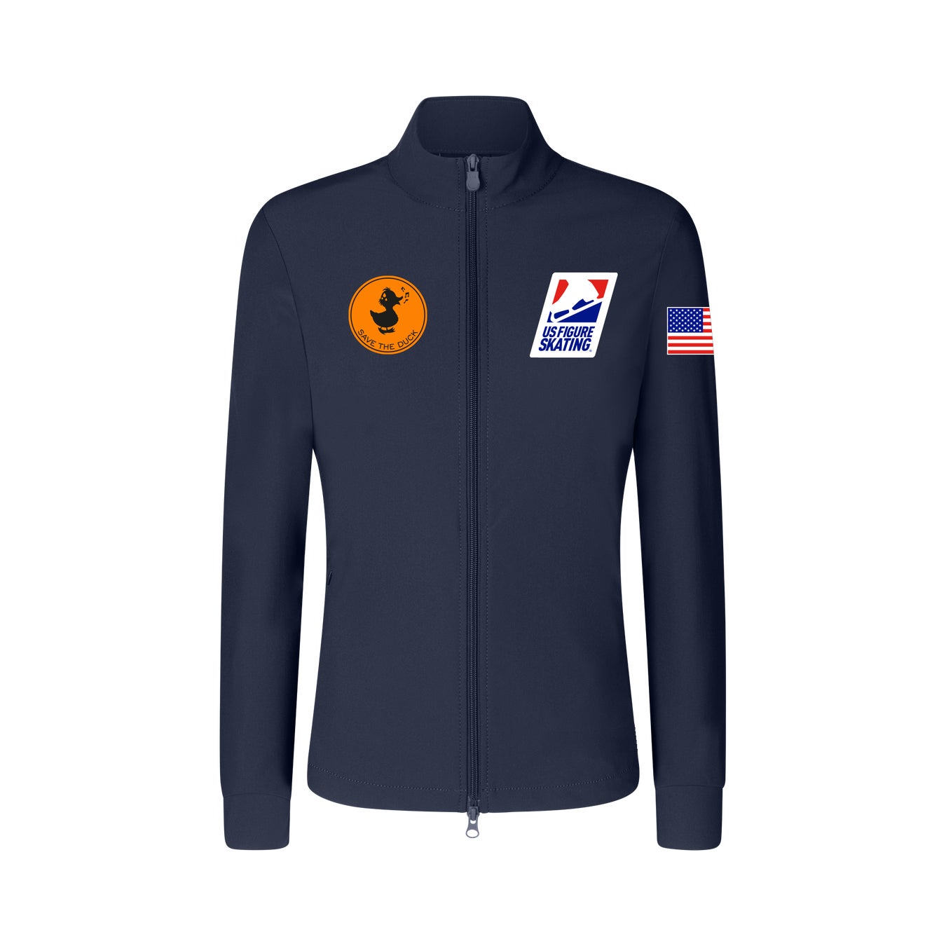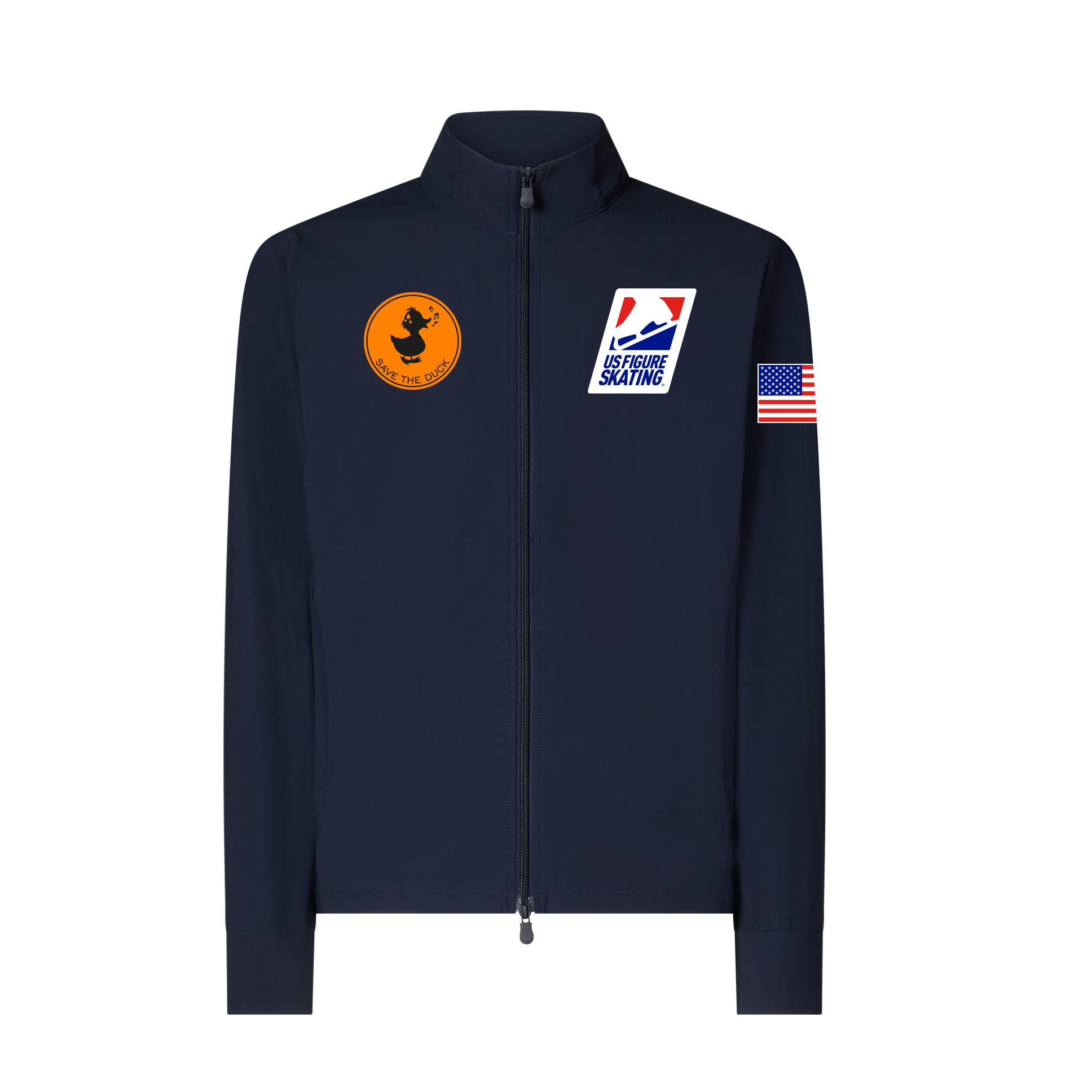 ネイビーブルーの公式チームジャケットには、リサイクルポリエステルとバージンポリエステルをブレンドした通気性と伸縮性の高い超薄型素材を採用。フルジップフロント仕様で、米国フィギュアスケート連盟とSAVE THE DUCKのロゴ、そして星条旗をあしらいました。ほかにも、Smartleisureコレクションのトラックスーツや、ブランドの中で最も保温性に優れたParkaコレクションのアウターなどを通してチームをサポートします。