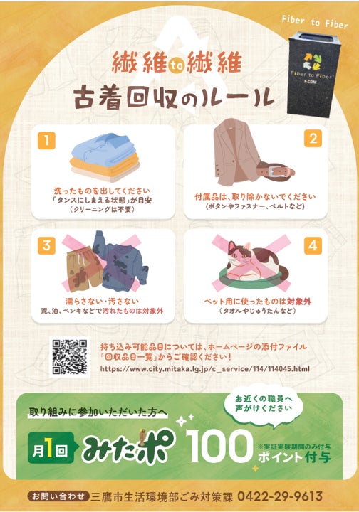 一般社団法人テキスタイルサーキュラーネットワーク(所在地:大阪府泉大津市、代表理事:臼谷喜世彦、以下 TC-Net)は、東京都三鷹市と連携し、2025年7月より、使用済み衣料品を原料として繊維へ戻す“繊維to繊維”リサイクルの実証実験を開始しました。その取組の一環として、2025年11月16日(日)開催「第13回ふじみまつり」にて、市民参加型のワンデー古着回収を初実施。家庭から持参された衣類が次々と集まり、多くの市民が参加しました。