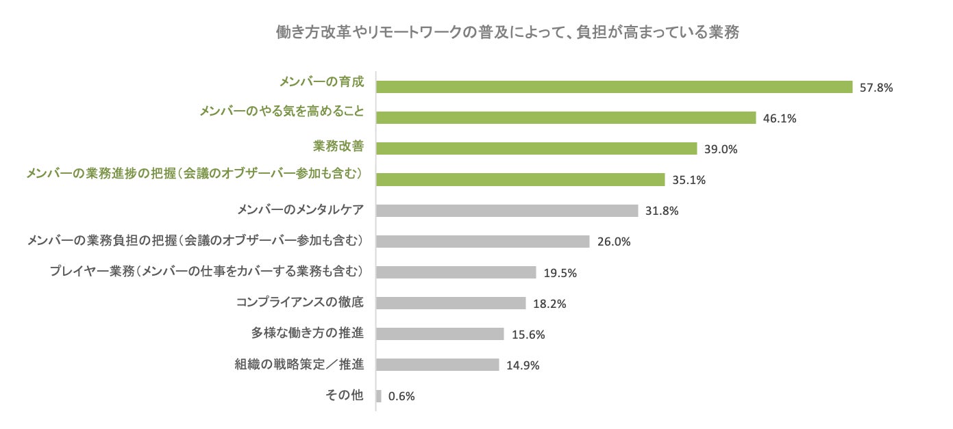 「とてもそう思う」「ややそう思う」と回答した方に、どのような業務の負担が以前より高まっているか聞いたところ、「メンバーの育成(57.8%)」「メンバーのやる気を高めること(46.1%)」「業務改善(39.0%)」「メンバーの業務進捗の把握(35.1%)」が上位になりました。