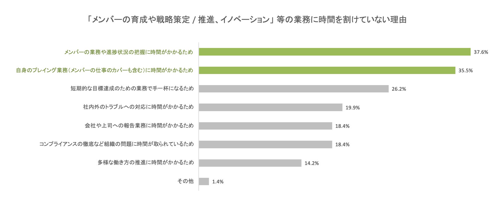 「戦略策定や実行、育成、業務改善」などの業務に、十分な時間を割けていないと感じている管理職に対してその理由を聞いたところ、「メンバーの業務や進捗状況の把握に時間がかかるため(37.6%)」「自身のプレイング業務に時間がかかるため(35.5%)」が上位となりました。