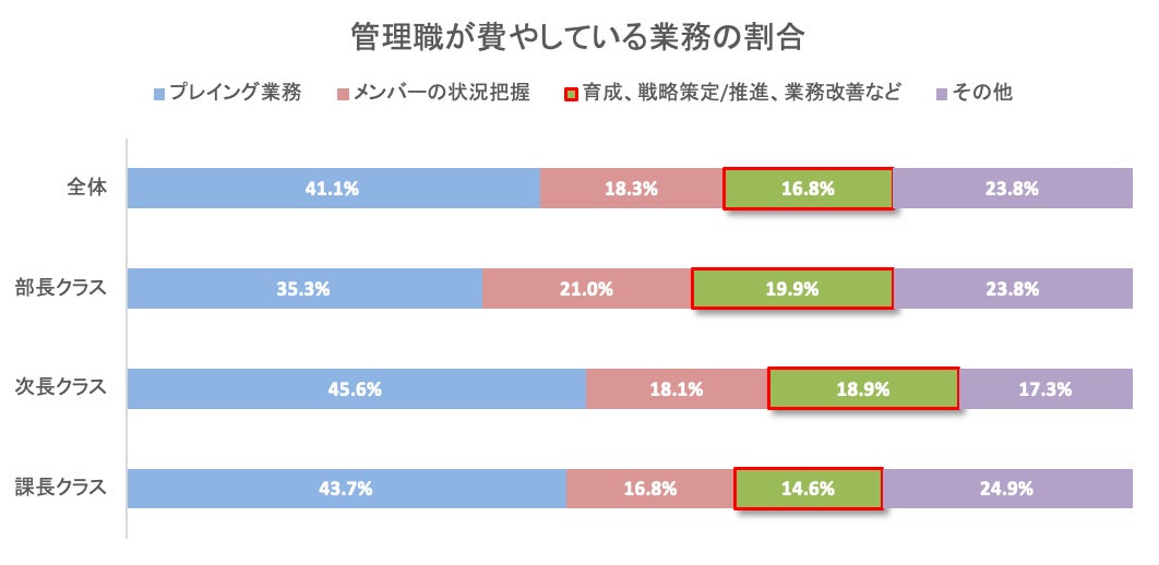 現場に近い次長・課長クラスでは、部長クラスに比べて「プレイング業務」に費やす割合が高く、メンバーの状況把握と創造的マネジメント業務に十分な時間を割けていないことが伺えます。特に、課長クラスの「戦略策定や実行、育成、業務改善など」に充てられている割合が低く(14.6%)、「プレイング業務(43.7%)」と「メンバーの状況把握(16.8%)」で業務の大半を占めてしまっている実態が見えてきました。