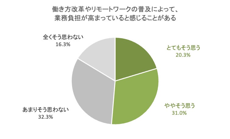 働き方改革やコロナ禍でのリモートワークの普及による管理職への影響について調査した内容。働き方改革やリモートワークの普及によって業務負担が高まっていると感じているか聞いたところ、「とてもそう思う(20.3%)」「ややそう思う(31.0%)」という結果になりました。