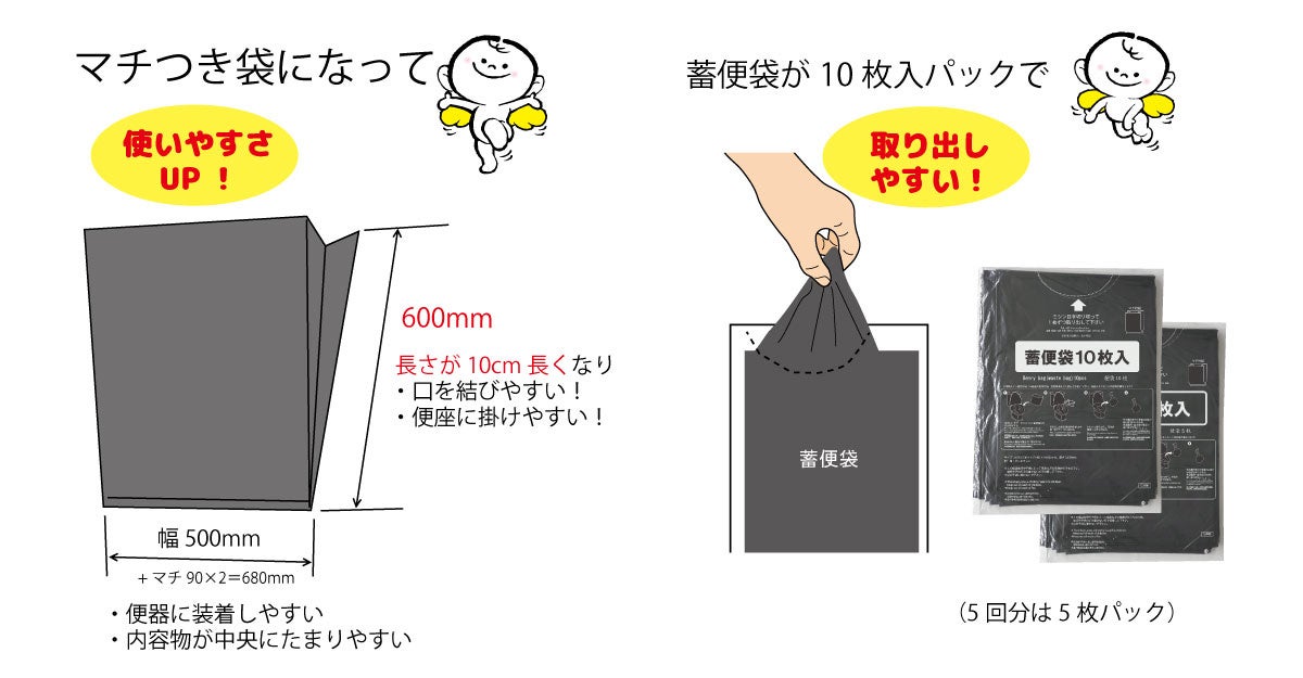 袋サイズを長くし、口を結ぶことが楽になるなど改良。使用原料に「バイオマスプラ」を10%使用し環境にも配慮しています。