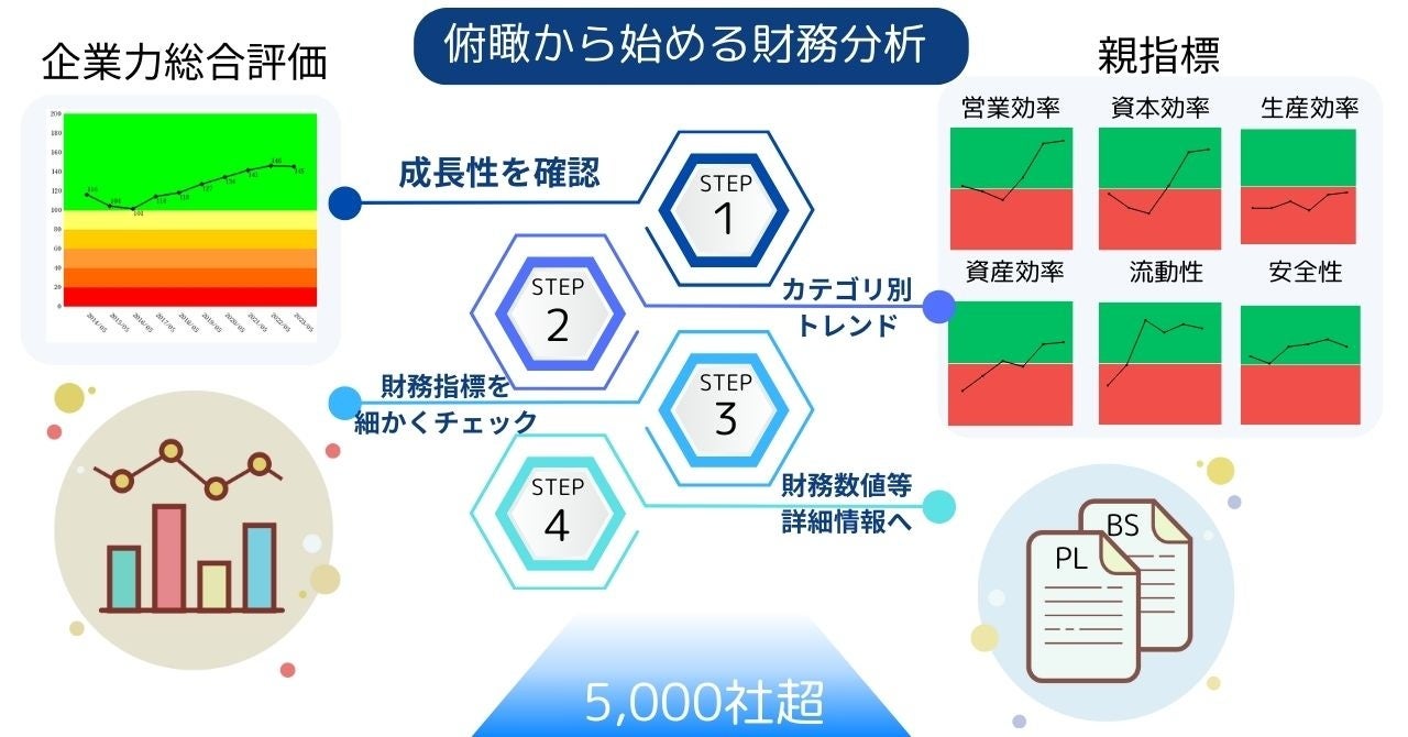 創業から20年以上、一貫して企業経営を分析してきました。私たちが提供するのは、「わかりにくいと思われがちな財務分析」に結論を持たせるサービスです。企業力総合評価など統合指標の仕組みについてはホームページでも詳しく解説しています。