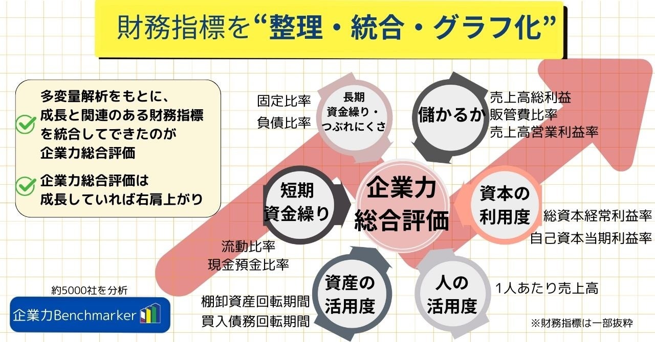 統合指標には企業力総合評価以外に「親指標」と総称する6つの統合指標(営業効率、資産効率等)があります。例えば、「儲かるか」についての財務指標群を統合したのが「営業効率」。「資産を活用できているか」についての財務指標群を統合したのが「資産効率」。親指標をさらに統合したのが企業力総合評価で、「右肩あがり=企業成長」と読みます。
