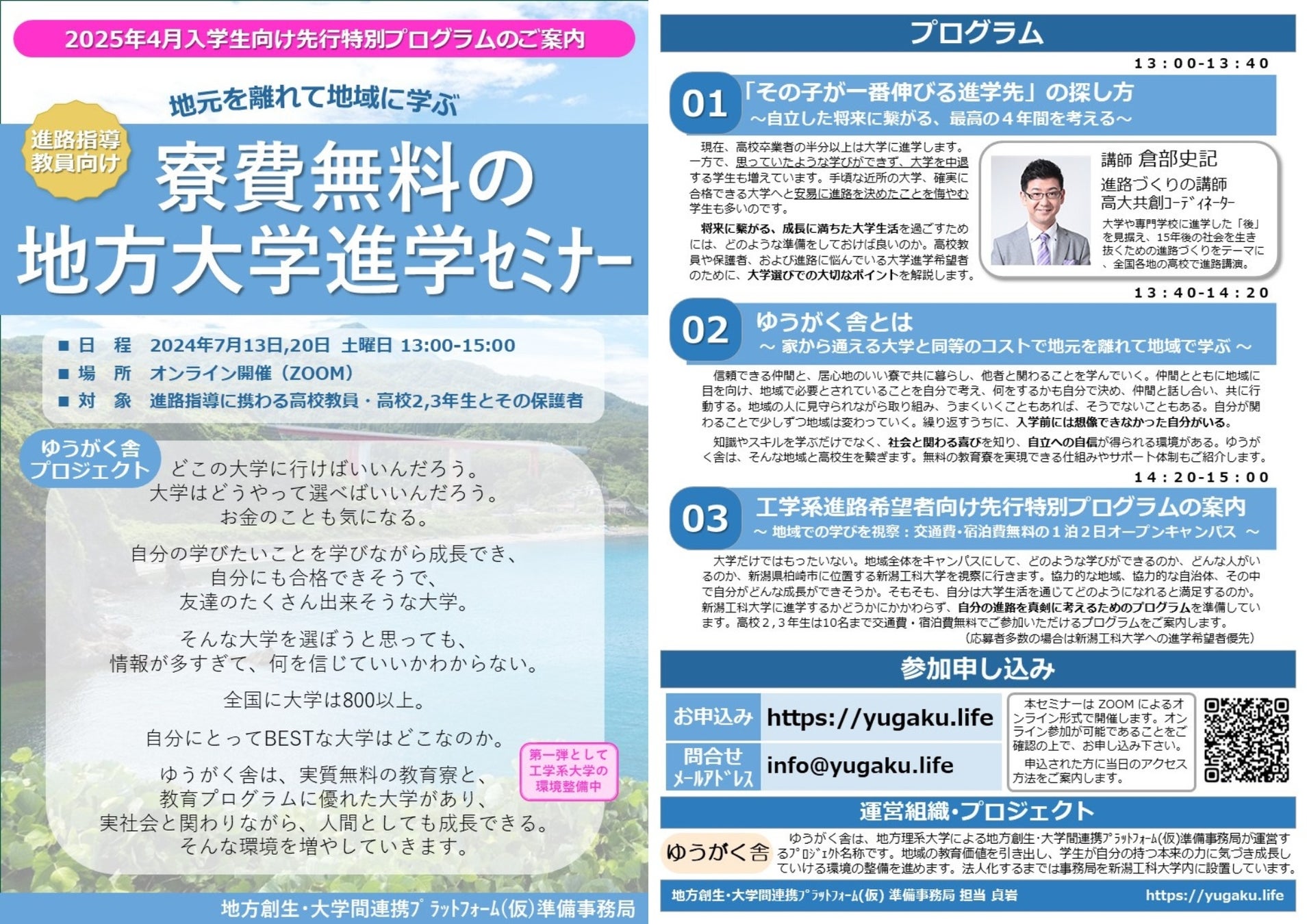 活動の一環として7月13日、20日に、高校教員や高校生・保護者を対象にした「寮費無料の地方大学進学セミナー」をオンラインにて実施します。