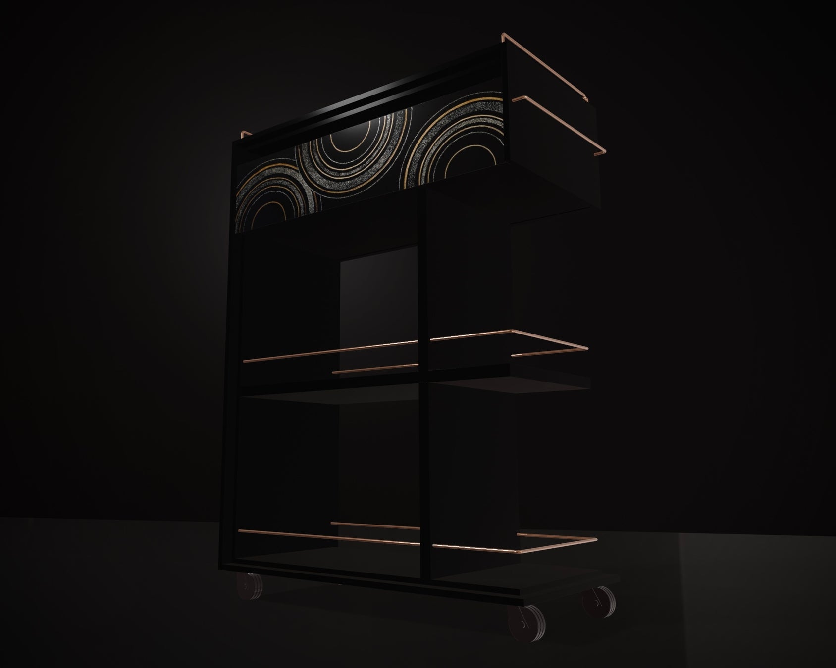 ※上記画像は過去に作製した木製のバーワゴンを黒色とし、 蒔絵のスケッチ画像を基に加工したものです。実際の完成品とは異なる場合がございますのであらかじめご了承ください。