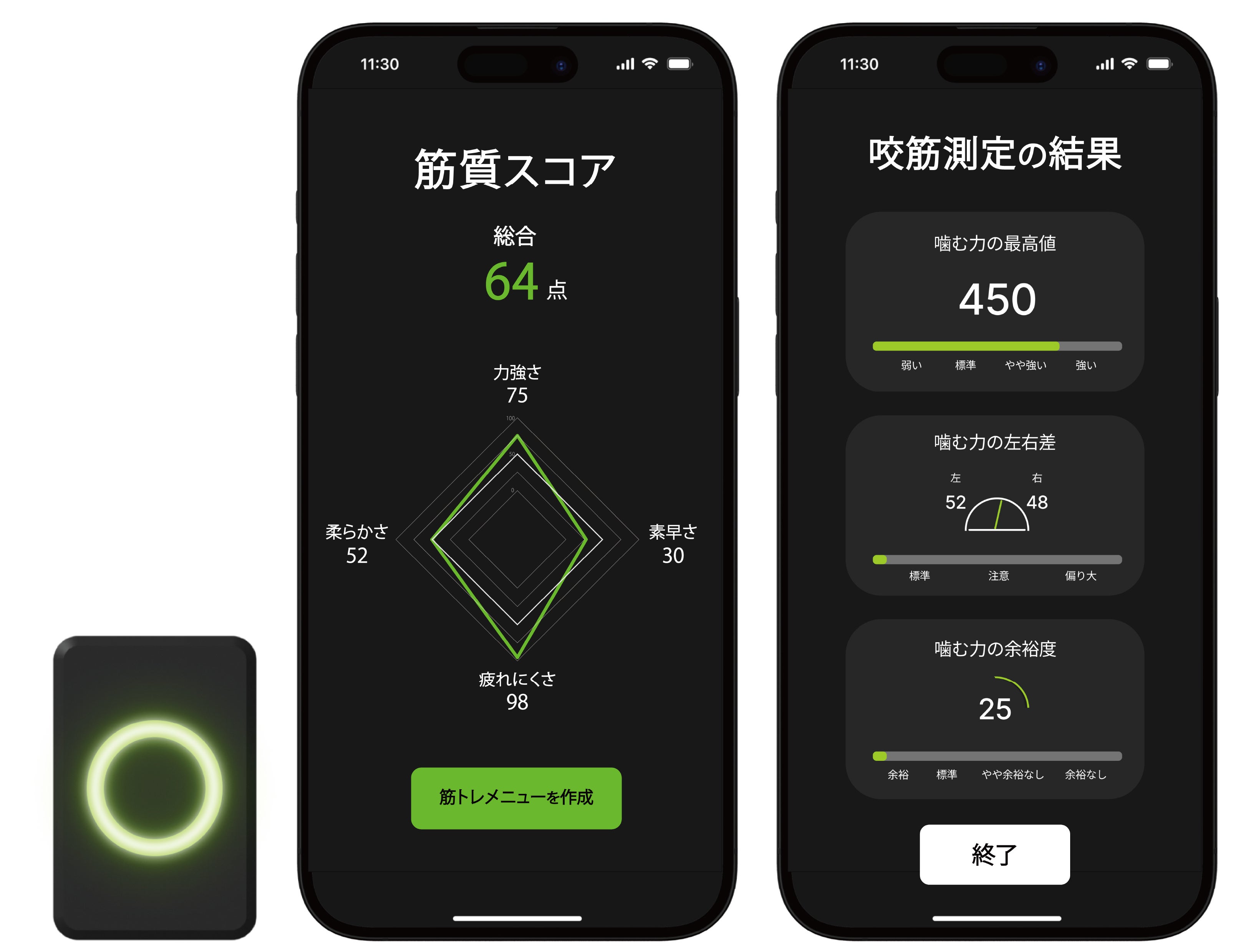 現在販売中のアプリはベーシック機能のみで、会場デモの「筋質スコア」「噛みしめ測定」モードは含まれません。仕様・外観は予告なく変更となる場合があります。