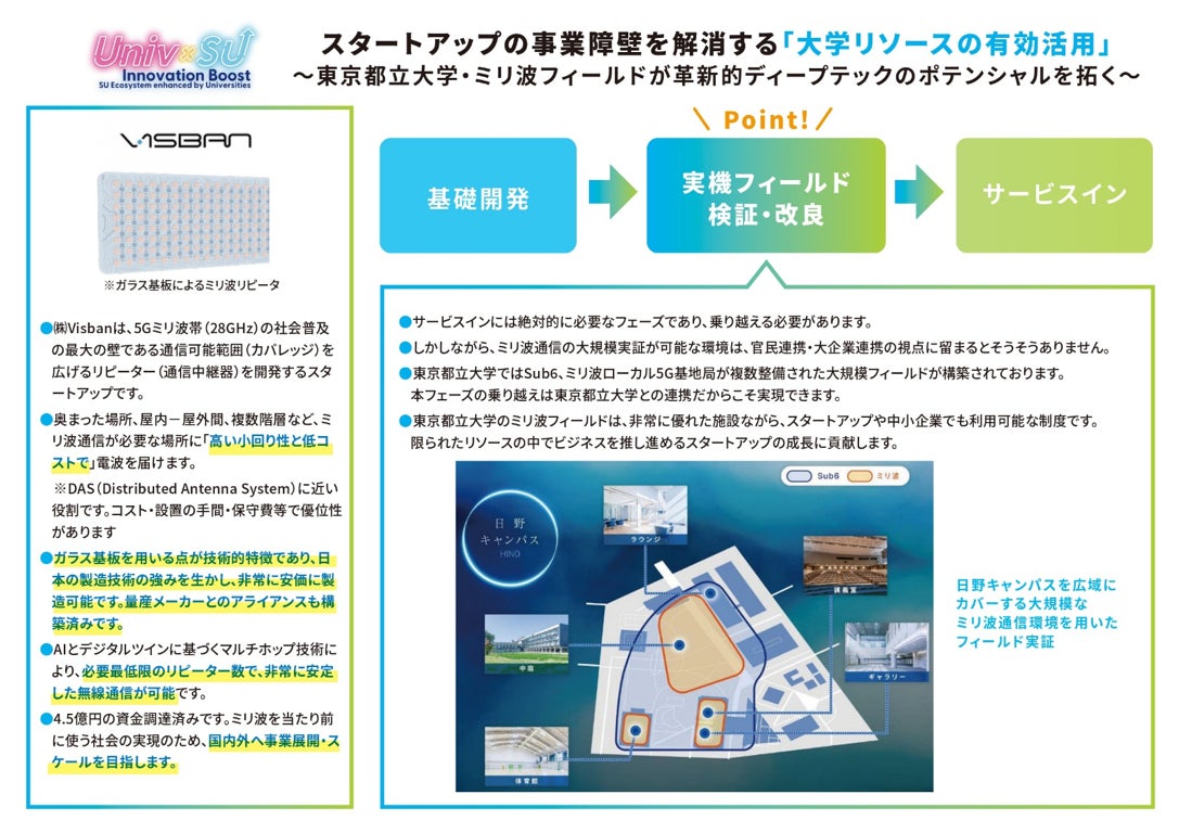 ミリ波の普及における主な課題は、カバレッジの制約、展開コストの高さ、そして用途の明確化です。ミリ波リピータに関する独自技術を有する株式会社Visbanは、東京都「多様な主体によるスタートアップ支援展開事業(TOKYO SUTEAM)」の採択を受けた株式会社キャンパスクリエイトの支援を受け、東京都立大学が保有するミリ波ローカル5G実験フィールドを活用しながら、これらの課題に正面から取り組んでいます。
