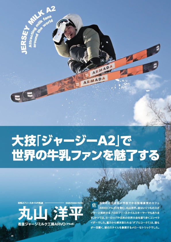 佐呂間町にてジャージー牛を育て、牛乳や飲むヨーグルト、ジェラートを生産している「丸山 洋平さん」です。北海道でも珍しいジャージー牛を100頭も飼育しています。実はいくつものスポンサーと契約するプロのフリースタイルスキーヤーでもあります。生産しているジャージー牛乳を持ちながら大ジャンプをしてもらいました。