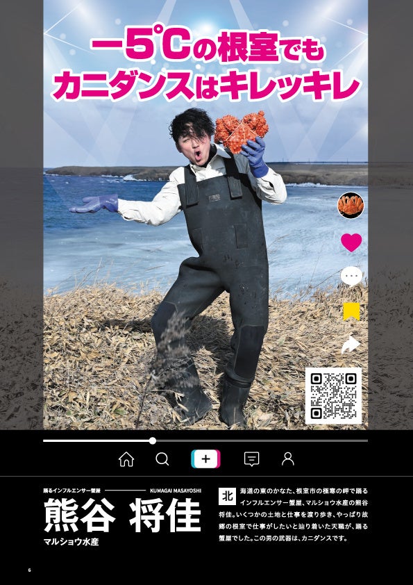 根室にあるマルショウ水産の生産者「熊谷 将佳さん」はSNSでフォロワー数1万人越えのインフルエンサーでもあります。「踊るインフルエンサー蟹屋」をテーマに花咲ガニをもって屋外でダンスしてもらいました。この日はとても寒くオホーツクの海面が凍っておりました。極寒の地で体を張って本気の撮影です。