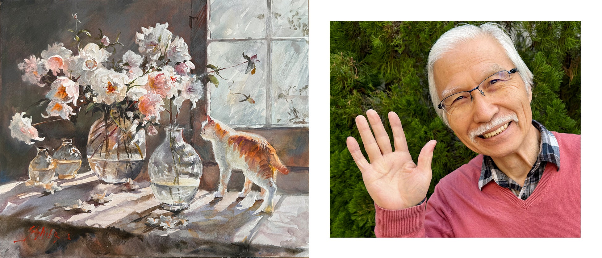 こんにちは、柴崎です。お元気ですか?この度、初めて東京の西新宿で個展を開催することとなりました。前回お会いした皆様、そして新たにお越しくださる皆様とお会いできることを心から楽しみにしています。今年の4月に京都蔦屋書店ギャラリーにて「柴崎春通 絵画展〜猫に想う」を開催し、猫と人間との関わりや猫本来の神秘的な野生の生態から生まれる心の交流を水彩画で表現しました。今回はその展示作品に加え、これまでYouTube動画で描いてきた作品や新作の花と猫の絵、そして静物画、風景画など多数展示する予定です。私の絵画は、自然の美しさや日々の何気ない瞬間を捉えその中に感じる温かさや静けさを表現することを目指しています。来場される皆様が、私の作品を通じてそのような感動や癒しを感じていただければ幸いです。個展期間中は全日在廊する予定ですので、皆様と直接お話しできるのを楽しみにしております。 柴崎春通