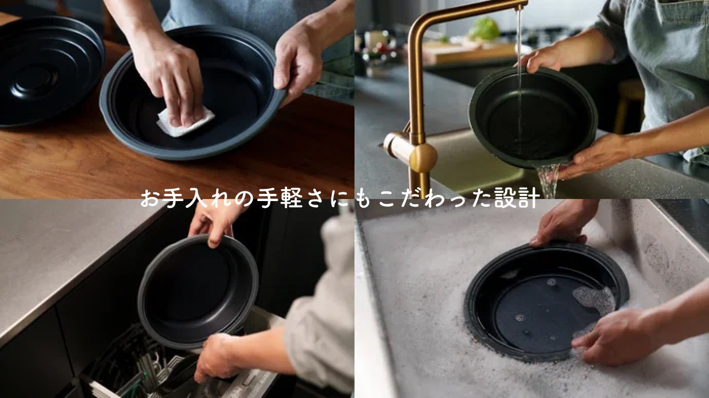 フラットな調理面はフッ素加工で食材がくっつきにくくお手入れ簡単。丸ごと水につけて洗えるので、食事後の洗い物も捗ります。もちろん、食洗機も使用可能。食べ終わった後は食洗機に入れるだけでOKです。