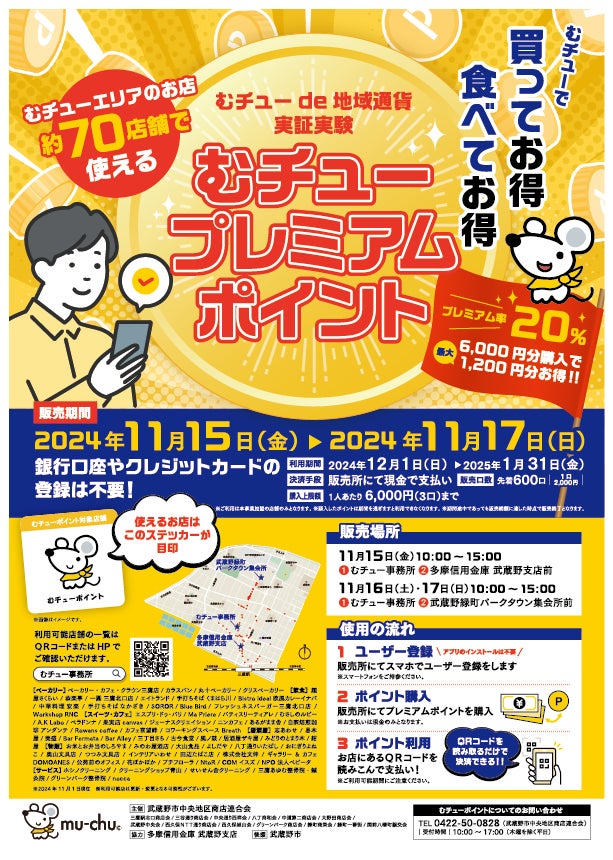 武蔵野市中央地区商店連合会様では、むチューde地域通貨実証実験<むチュープレミアムポイント>として、2024年12月1日から2025年1月31日の2か月間で、これまでの紙運用だった商品券を電子ポイントとして運用します。
