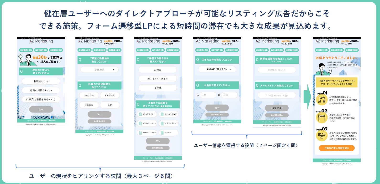 一般的なランディングページでは、広告経由での流入後、約70%がスクロールをせずにファーストビジュアルだけで離脱をしてしまいますが、本ランディングページは、ファーストビジュアルから設問を表示させているため、短時間の滞在でもフォーム入力を進められることが可能となっています。