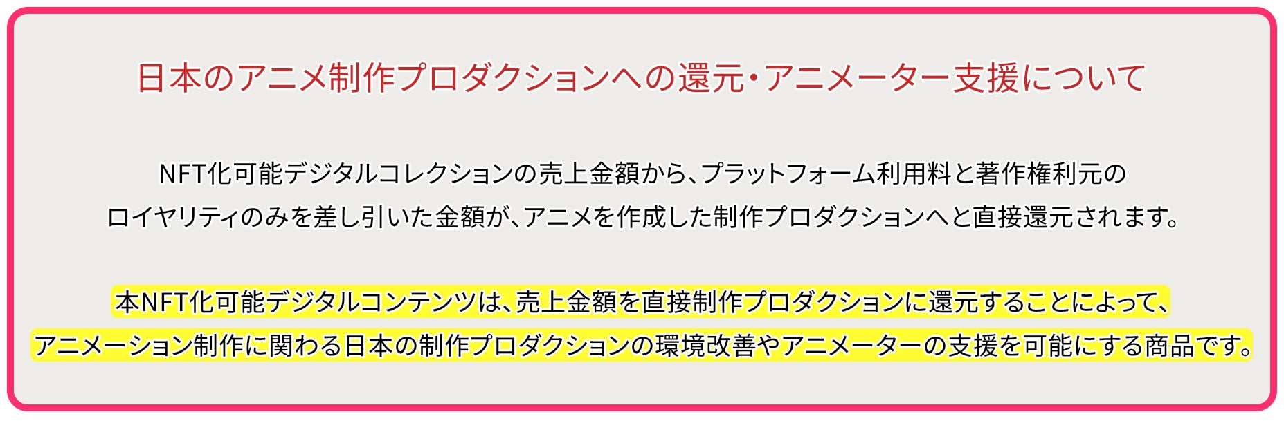 また、アニメ制作会社を支援する観点から、「Digitelier」でのデジタルコレクションの売上はアニメ制作会社とTokyo Anime Artifactsで配分され、NFT取引によって売買が成立した際にはロイヤリティがアニメ制作会社に支払われます。