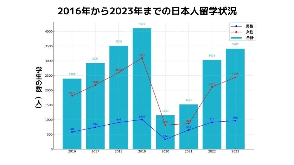 マルタ島への日本人留学生は2019年に近年のピークを迎え、以降は新型コロナウイルスの影響で2020年に縮小しました。2023年は2019年の約8割まで回復しており、近年の円安による出国控えの風潮はあるものの、順調に推移しています。