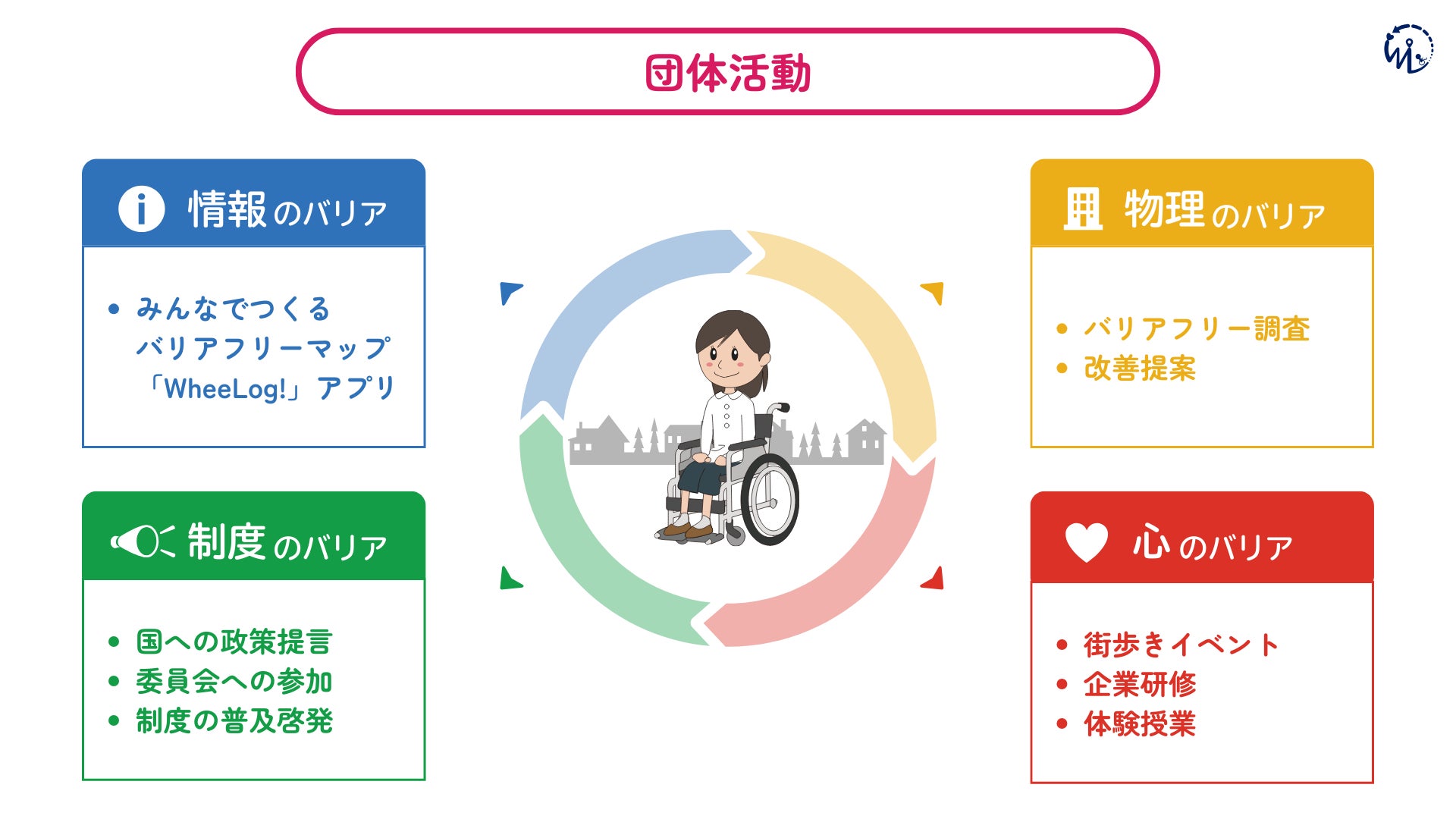 『車いすでもあきらめない世界をつくる』をミッションに掲げ、障害者や高齢者などの移動や日常生活に困難を抱える方に対して、日本最大級のバリアフリーマップ「WheeLog!」(読み:ウィーログ)アプリを通して、バリアフリーに関する情報発信を行っています。同アプリは10万人以上のユーザーに利用され、世界中で活用されています。同時に、さらなるバリアフリー推進のためにバリアフリーに関する調査研究、研修教育、普及啓発等の事業も行い、誰もが希望をもって社会に参画できる、バリアフリーなまちづくりに寄与することを目的に活動しています。