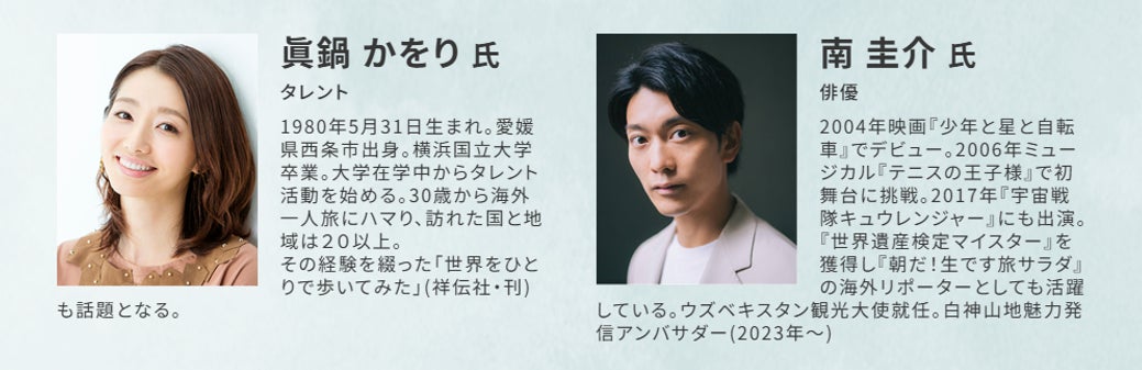 旅の楽しみ方を広く伝え続けてこられたタレントの眞鍋かをり氏と世界遺産検定マイスターでSDGsへの関心も深い俳優の南圭介氏。お二人の経験を交えて世界自然遺産の旅の楽しみ方を語っていただくトークセッションです。