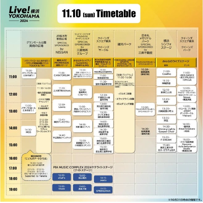 『Live!横浜2024』開催期間である11月9日(土)、10日(日)、16日(土)、17日(日)の4日間の8つの街なかステージの会場別タイムテーブルを発表します。