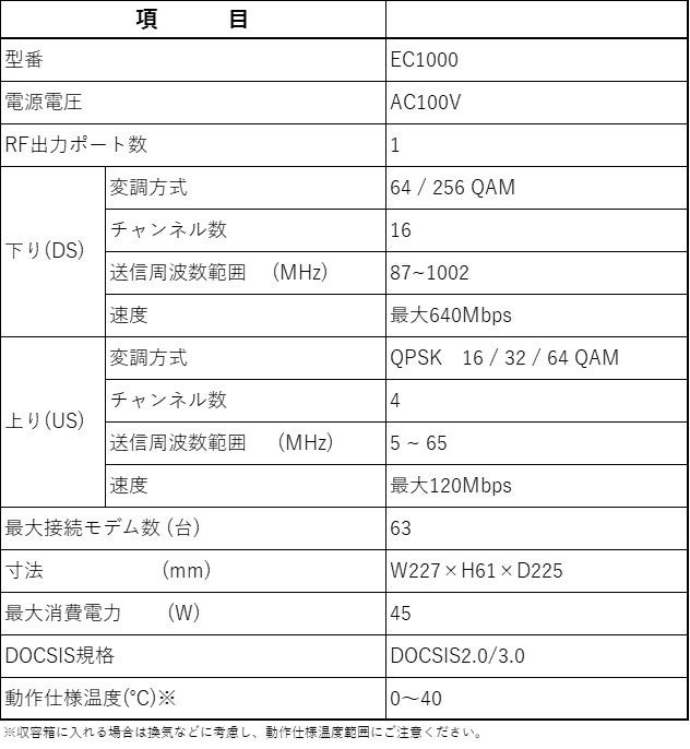 屋内用小型CMTS『EC1000』を使用した棟内ケーブルモデムシステムは、既設のテレビ用同軸ケーブル配線 を使用するため新たに棟内に新規配線工事をする必要がなく、工期とコストを抑えることができます。また安定した高速通信環境も構築可能です。