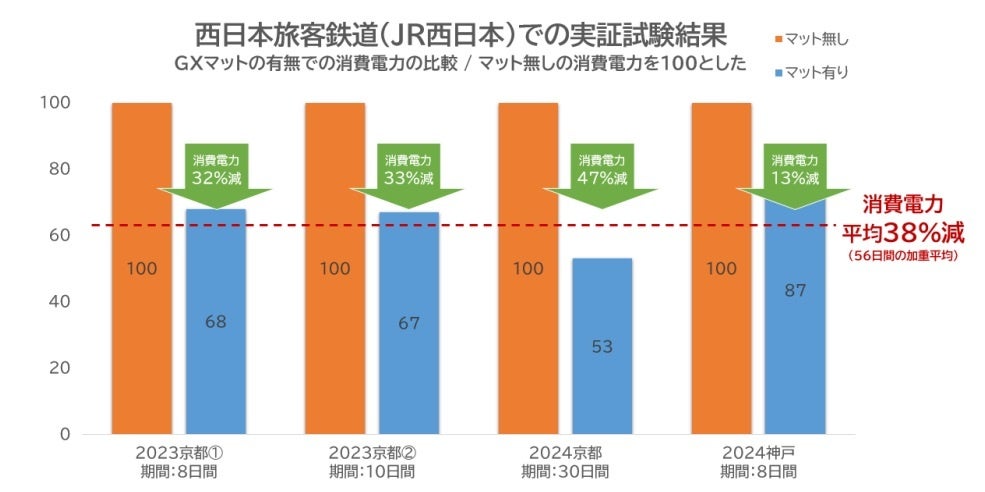 「GXマット」で夏場の空調電気代を、平均38%削減! JR西日本との共同実証実験で効果を確認いたしました。