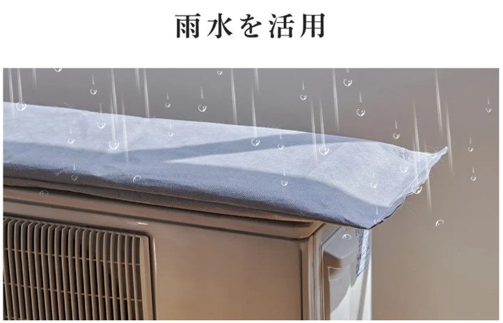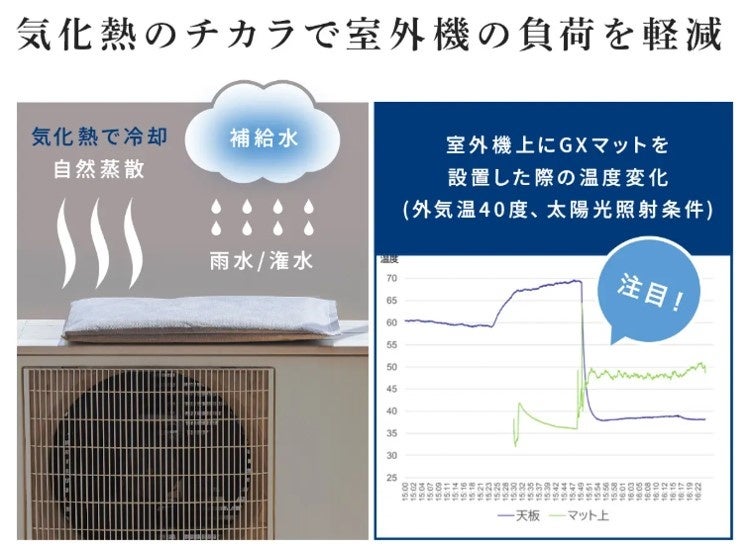 「GXマット」は、空調室外機の上に簡易に取り付けることで、雨水を活用して効率的に冷却効果を発揮し、電気代を削減する新素材製品です。本製品は、雨水のみで一週間程度水分を保持できるため、メンテナンスも簡単です。