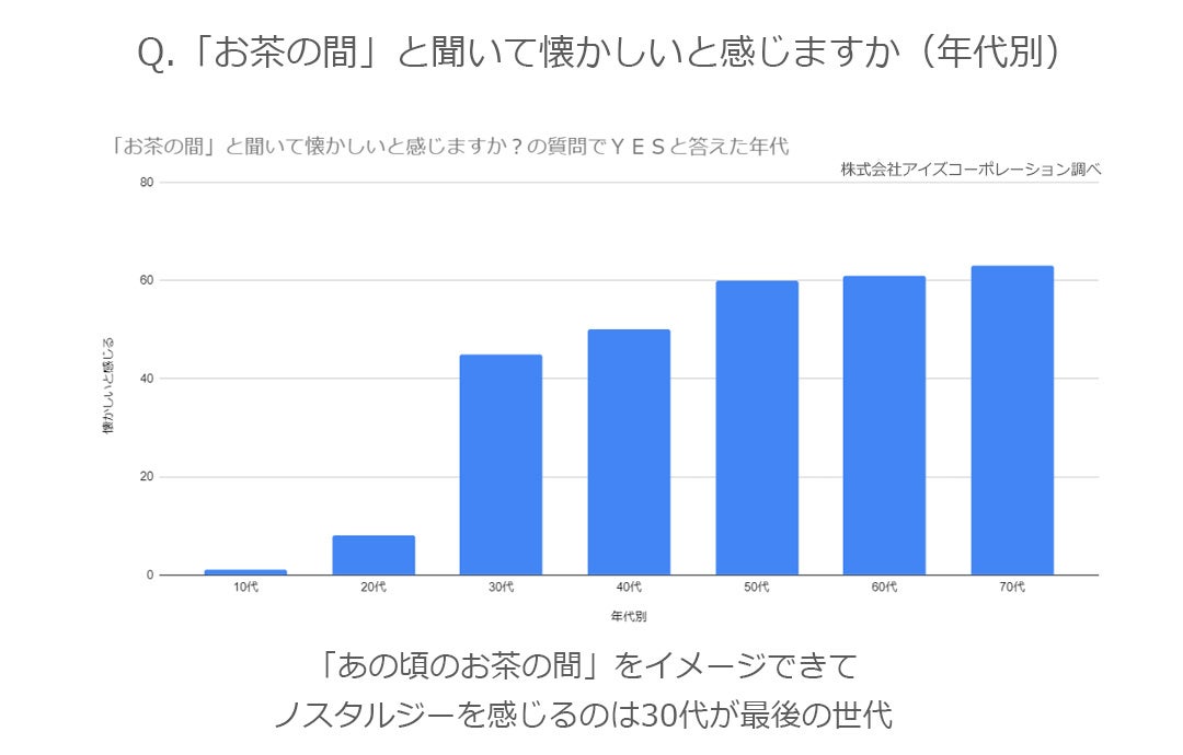 調査の結果、お茶の間というワードに対して「懐かしい」と感じてノスタルジーを感じていただける世代は、30代が最後という結果になりました。何をするでもなく、自然と家族が集まる場所があった「日本のお茶の間」が与えてくれた恩恵を、再確認できる最後のタイミングかもしれません。
