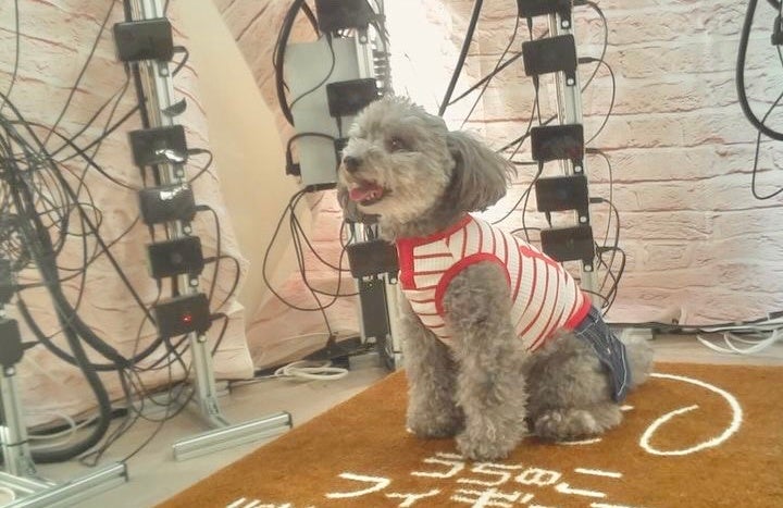 撮影台にワンちゃんを乗せ、64台の高性能カメラで360度から3D撮影を行います。撮影は通常のカメラと同じようにパシャっと一瞬で撮れるため、ワンちゃんが長時間じっとしていなくても大丈夫です。