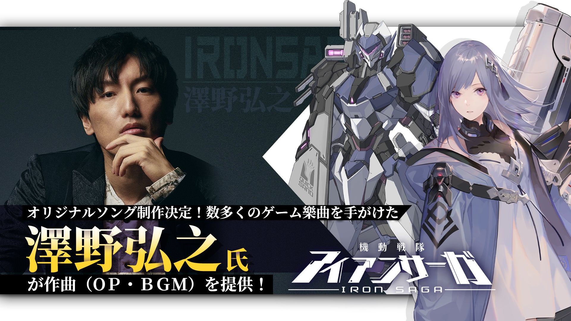 熱いロボット作品『機動戦隊アイアンサーガ』には、超豪華なクリエイター陣が集結しています!有名な作曲家・澤野弘之氏がOP、ED、BGMを手掛け、著名なアニメーターでありメカニックデザイナー、さらに監督でもある大張正己氏に、ゲーム内の機体デザインを担当していただきました。