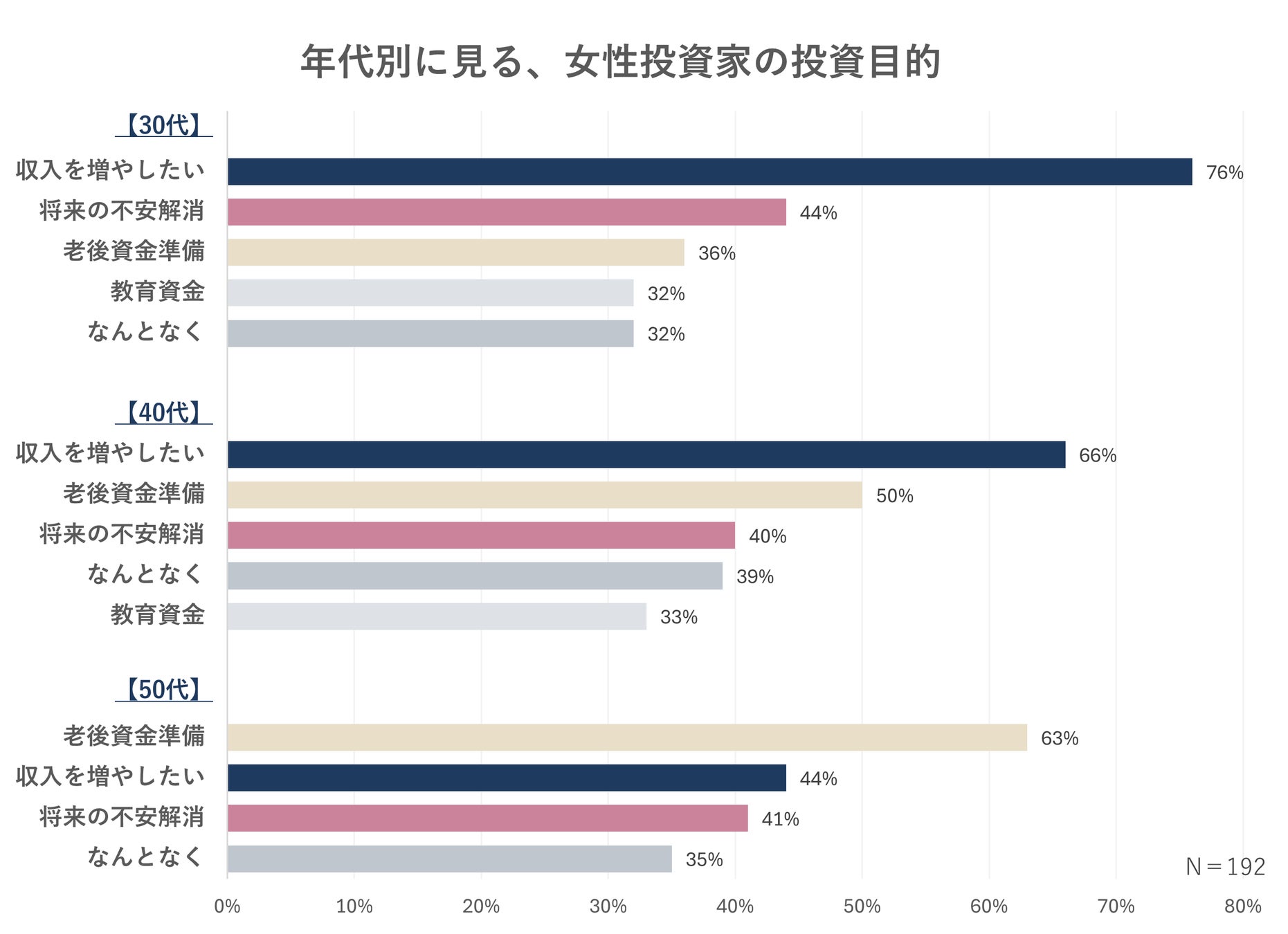 年代別に投資目的をみると、30〜40代では「収入を増やしたい」が約7割で最多となりました。一方、50代では約6割が「老後資金準備」となり、年代によって投資目的が収入重視から老後重視へ移行していることが明らかになりました。また、30〜50代の3割超が「なんとなく投資を開始している」点も特徴的です。