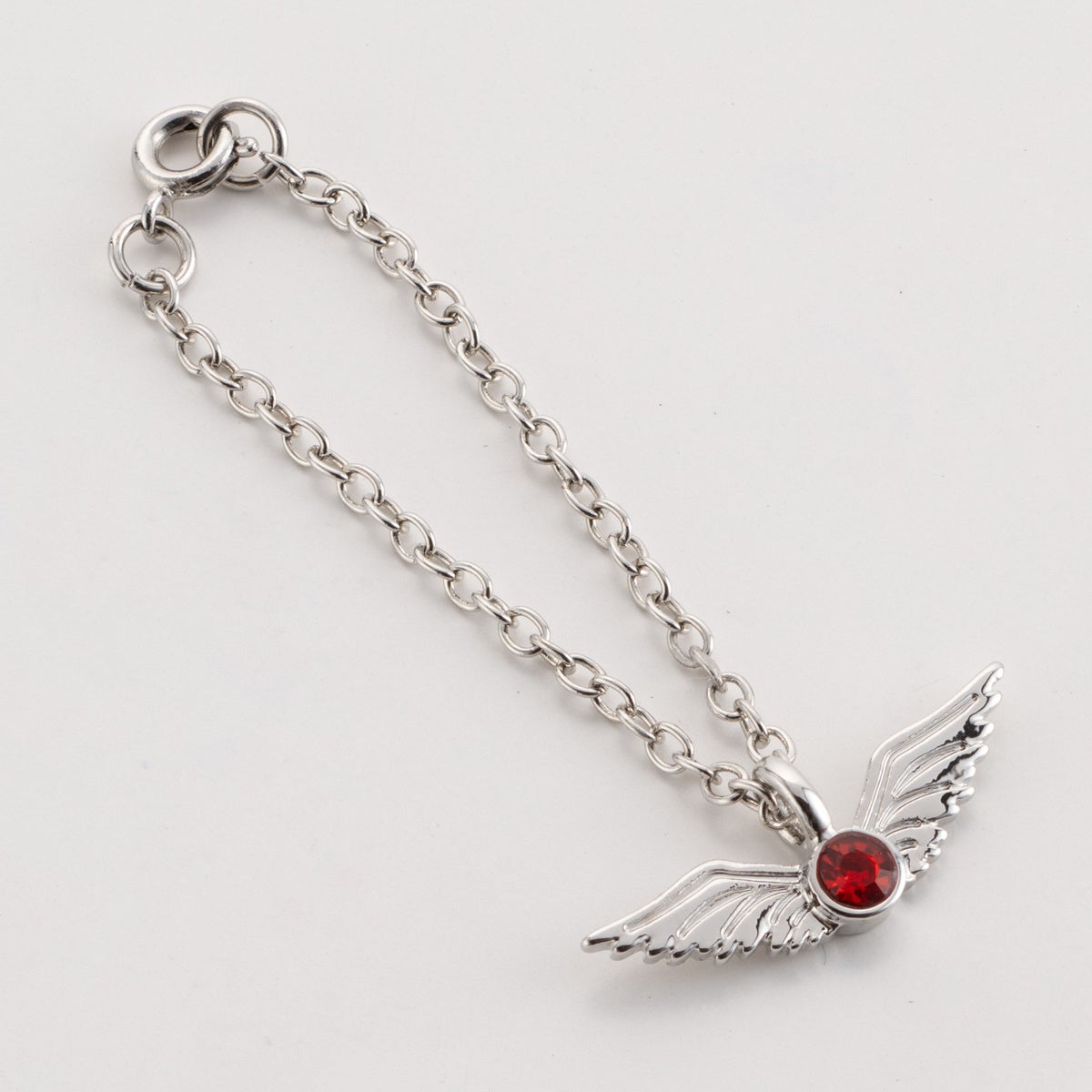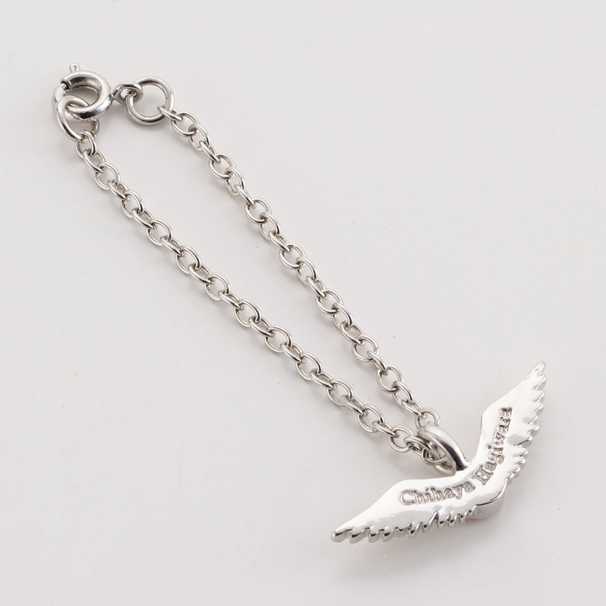 風の女神をイメージした翼型のチャーム。中央には千速の口紅をイメージした紅色のストーンが輝き、裏面には萩原千速の名前が刻印されています。