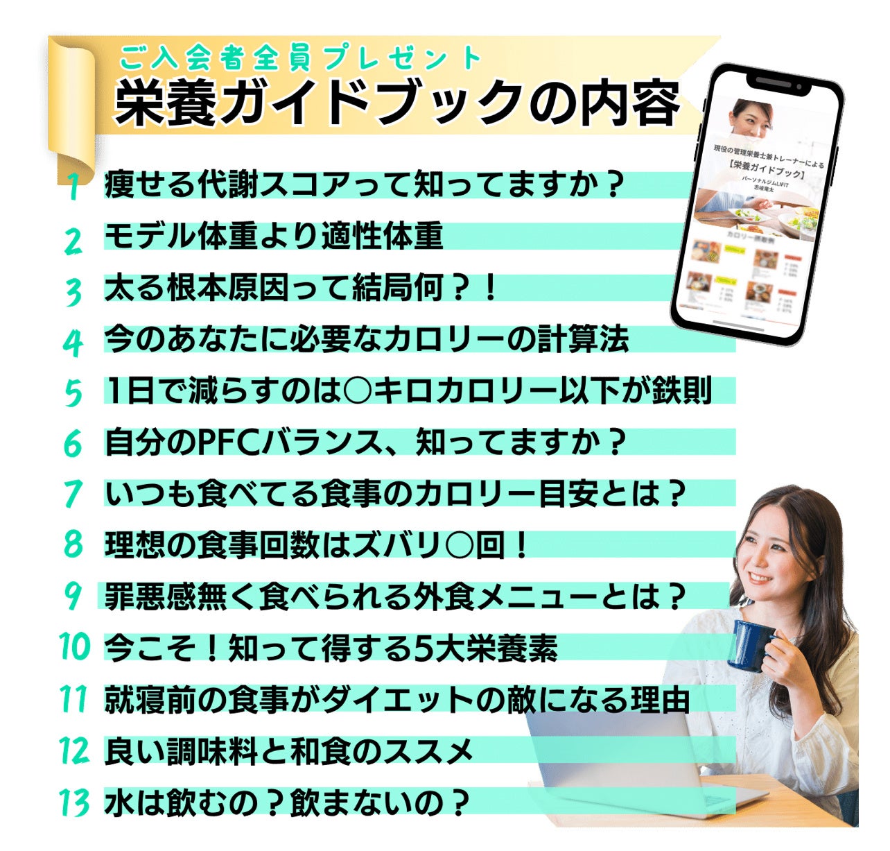 ご入会者全員に、管理栄養士×分子栄養学アドバイザーが現場での経験と、栄養学観点からダイエットや体作りにおいて必要なことだけをピックアップした一生使えるガイドブックを差し上げています。