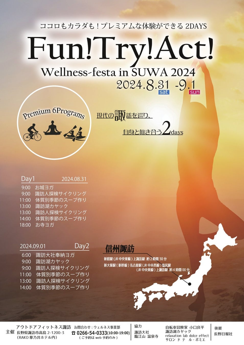脈々と受け継がれる歴史と文化・美しい自然に、現代のアクティビティを調和させ、その魅力を発信するウェルネス・フェスを、今年、初開催致します。諏訪の魅力に触れながら自身と向き合い、癒されるー歴史や文化といった古くからの魅力が、現代のウェルネス、ウェルビーンにつながるイベントです。