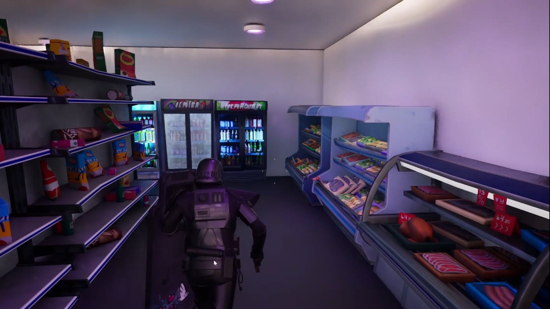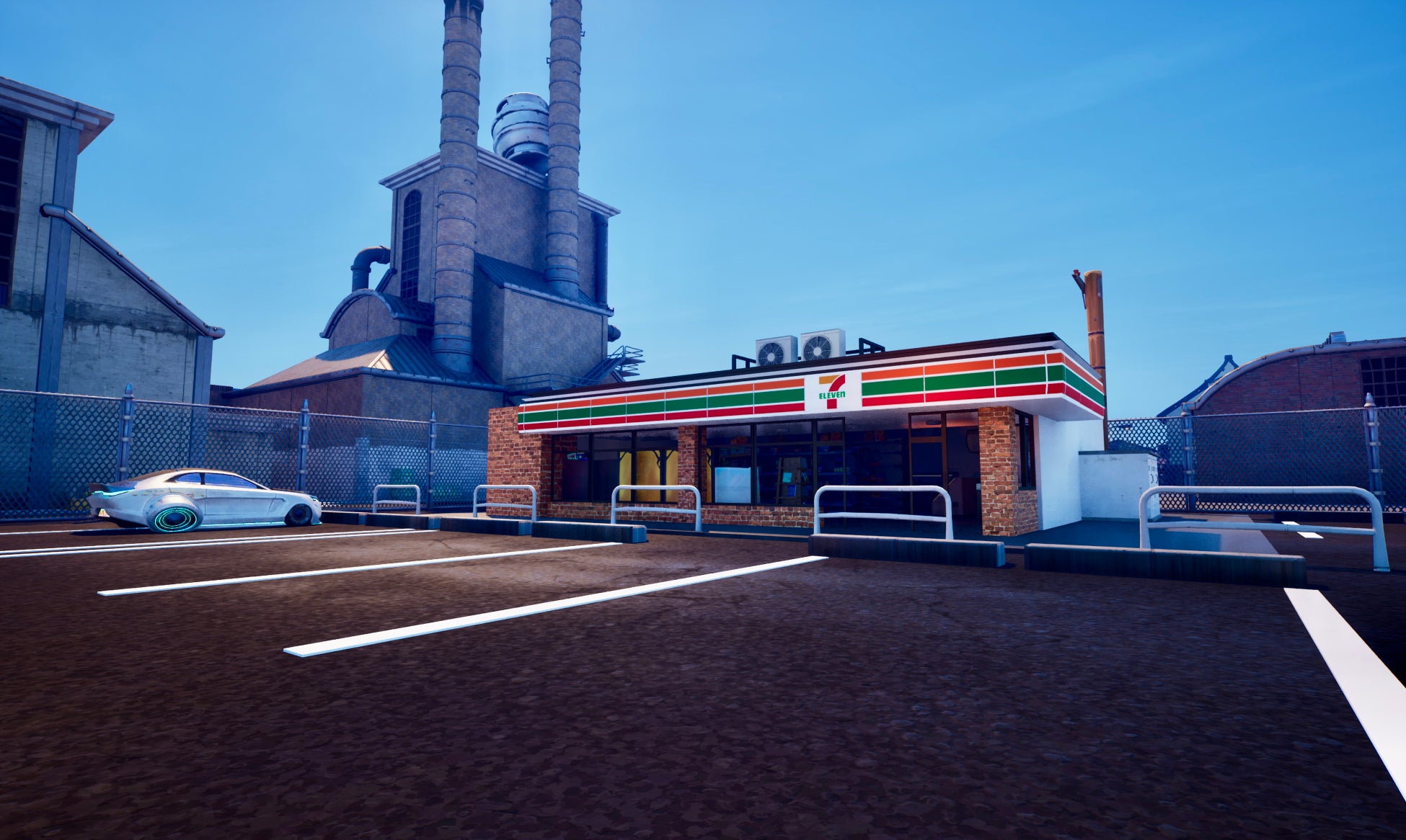 舞台となる店舗は、セブンイレブン桑名江場店の実際の写真をフリーの統合型3DCGソフトBlender(ブレンダー)に読み込み、読み込んだ写真をフォトモデリングの手法を使って再現しました。店舗内のレジ、棚、商品は、Fortnite(フォートナイト)の開発ツールUEFNが提供するアセットを使用して制作しています。