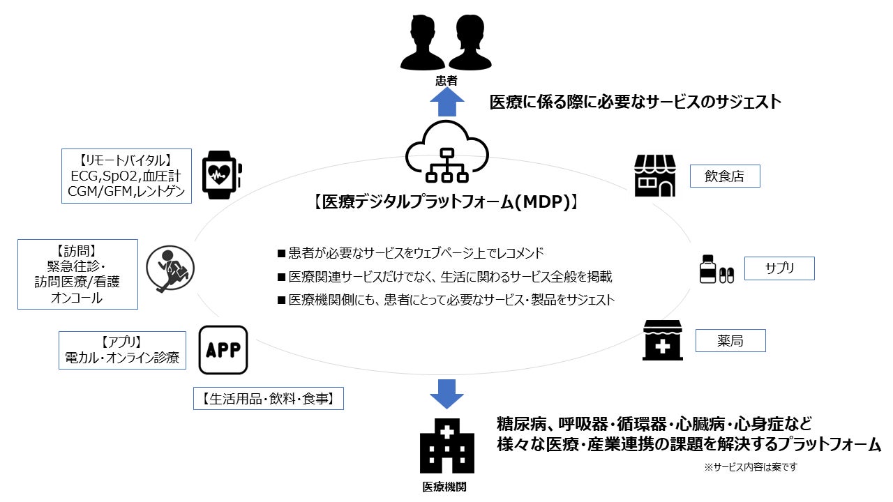 本研究プロジェクトでは、地域の関係者と医療機関・薬局・訪問看護・関係事業者がオンラインでつながることで、より有機的なネットワークが機能する状況を検証するため、医療デジタルプラットフォーム(MDP)の構築及び有効性の検証を行います。