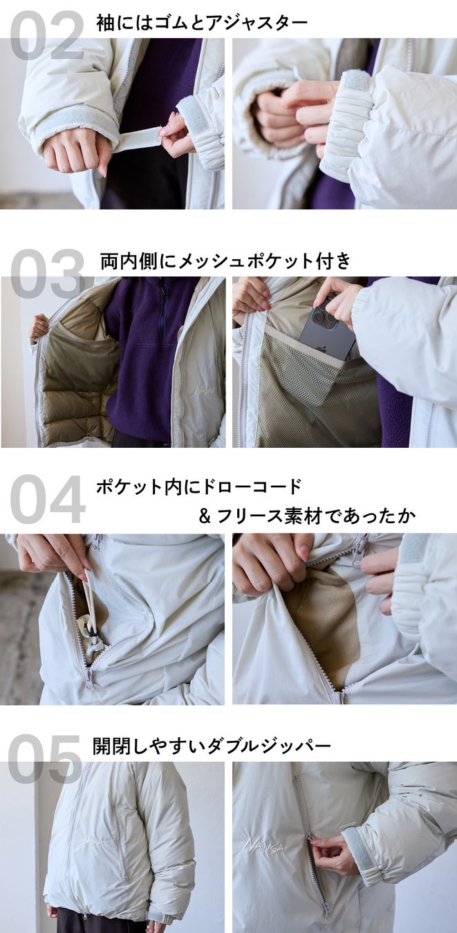 「ダウンと言えばハッピージャケット」といわれるほど、着回し力抜群で大人気のデザインをNANGAで初めて採用。アウトドアシーンだけでなく通勤や日常使いのしやすさに拘り、どんなシーンでも使えるダウンに仕上げました。高い技術力とダウンへの拘りを持つNANGAとの共同開発により、デザインだけでなく防寒・撥水・軽量に優れたダウンが誕生しました。