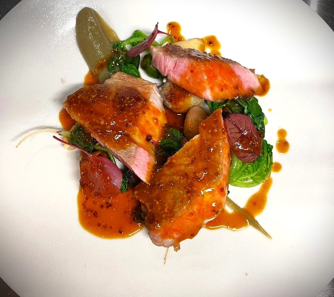 全4品からなるコースはみかんや熊野牛といった地域ならではの食材を楽しむ前菜5種からはじまり、メインの梅豚もも肉のロースト醤油麹バターソース、デザートにはさつまいもと柿といった秋の恵みをふんだんに使いました。彩り豊かで見ても楽しい料理をこの機会にぜひご賞味ください。